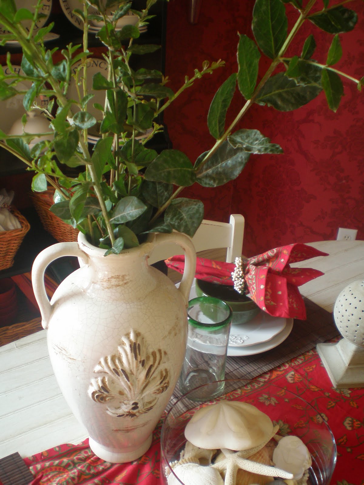 I added some fresh greenery from the backyard and plopped it into this vase and took some photos this morning to show all of you my interpretation of “Under the Tuscan Sun” tablescape in deep rich colors.