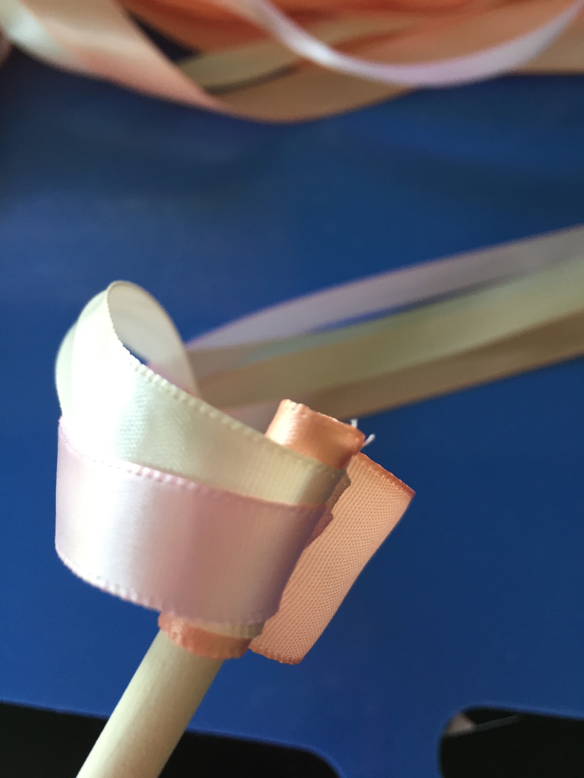 I cut the ribbon 24′ long and grouped three different colors and widths of them together at one end.