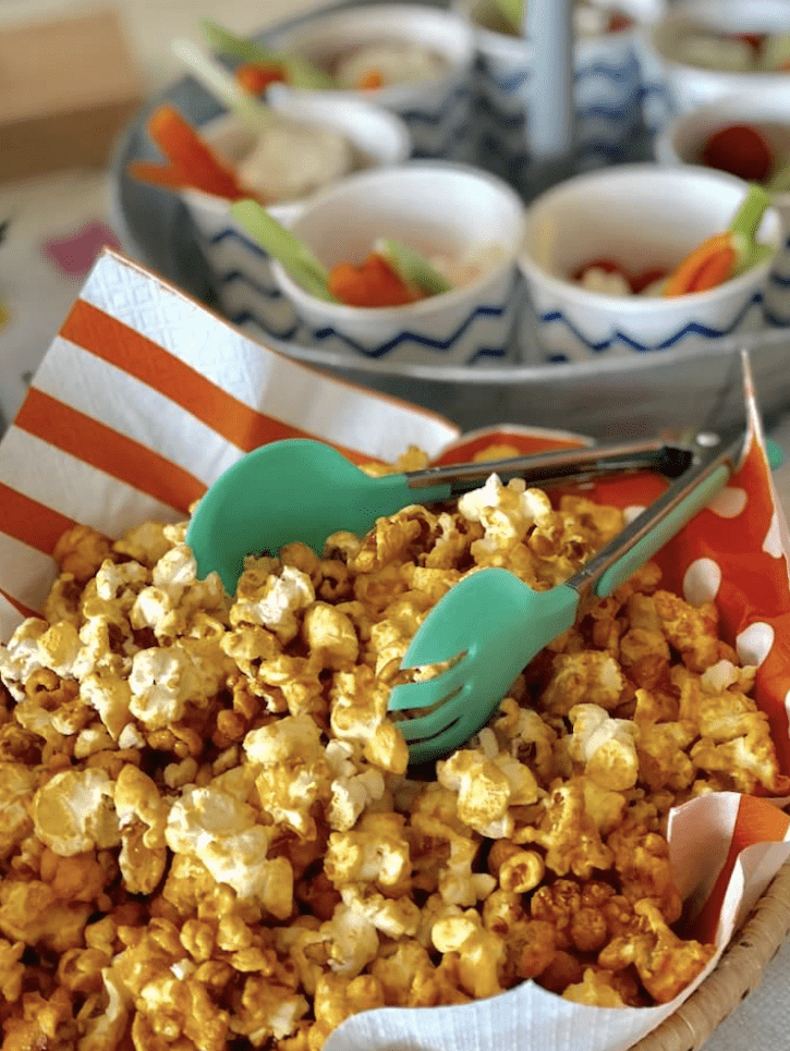 A simple basket lined with a bright, striped paper napkin (from Target) held caramel popcorn. Easy, colorful, and always a hit.