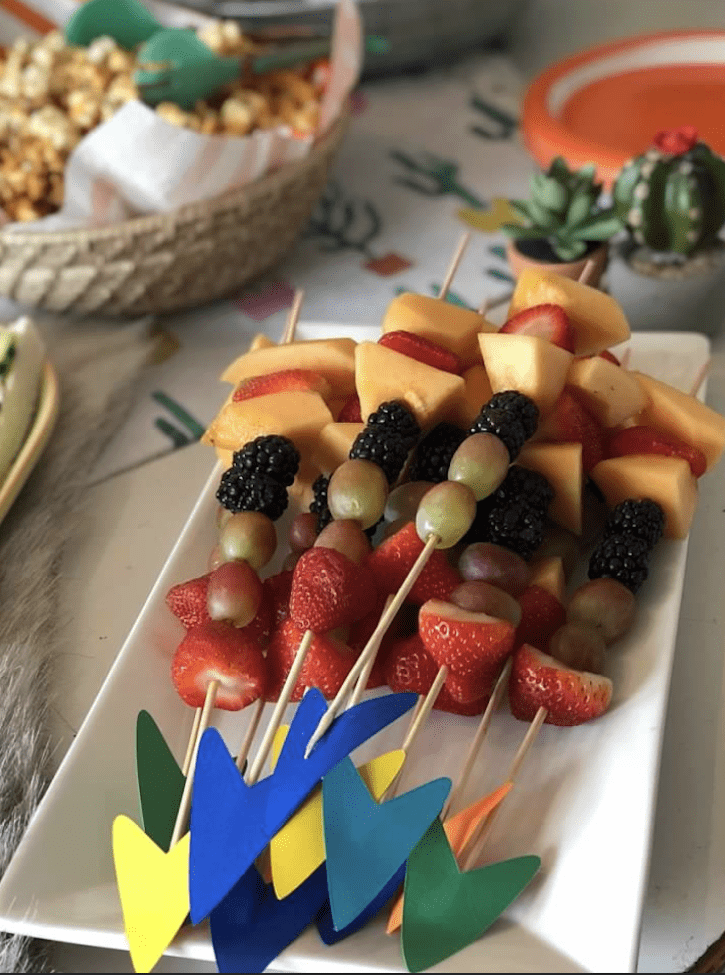 Fresh fruit was skewered in a random order onto wooden skewers. I hot glued paper arrow points to the tips so they looked like large arrows — such a simple way to keep the theme going.