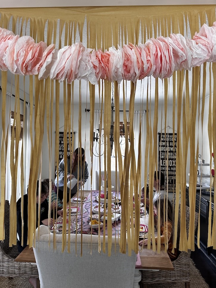We hung the fluffy coffee filter garland that my friend made years ago for my daughters bridal shower. I love this thing! You can crumple it up and stuff it in a box and fluffy it out again when you are ready to use it.