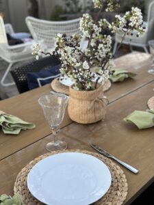 Creating an Outdoor Dining tablescape is one of my favorite ways to celebrate the warmer months, and setting a pretty table makes the experience even more special. Today, I’m sharing a fresh and simple outdoor dining tablescape filled with natural textures, classic whites, and a pop of cheerful spring green. It’s easy to recreate with items you may already have on hand—and it’s perfect for a casual backyard dinner or weekend brunch with friends.