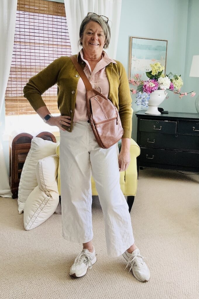 You can see how I styled multiple looks with just a few pieces. The golf pants in tan, green and I threw in a black pair were the workhorses in this wardrobe. Mixing them with cardigan sweaters, jackets and scarves. My black wide-leg pants paired beautifully with a striped tee and black jacket for a business-ready look. The green cropped pants were perfect for casual days, and the denim jacket went with everything.