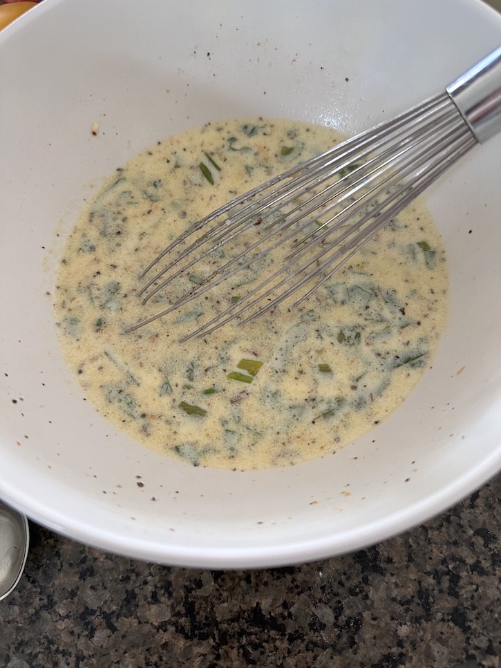 - Whisk together eggs, cream/half-and-half, salt, and pepper.