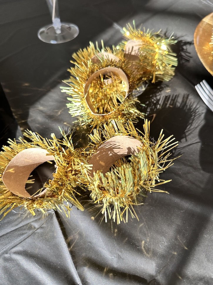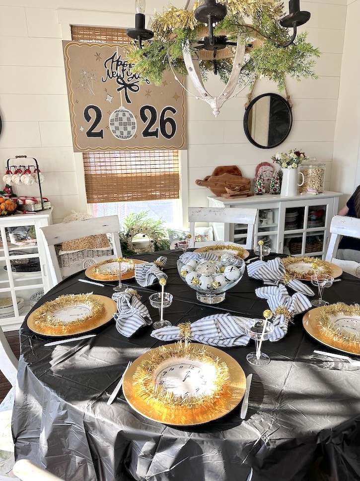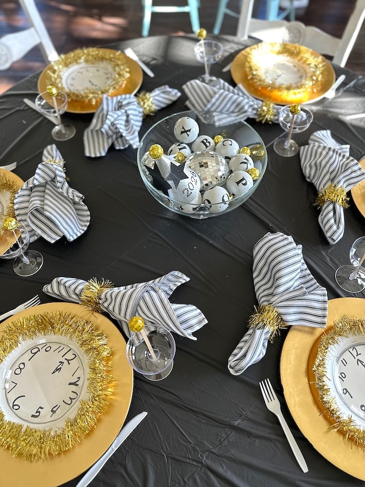 I started with a round black plastic tablecloth, which instantly sets the New Year’s Eve mood. It’s inexpensive, easy to clean up, and makes everything on the table stand out. From there, I layered in a few handmade touches that made the table feel festive and playful — perfect for a Noon Year’s celebration.