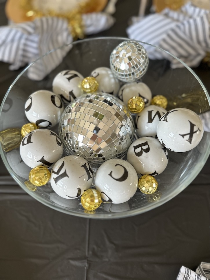 My granddaughter had so much fun decorating mini silver party hats using black and white stars, gold fringe garland, and little odds and ends from my craft stash. We tucked a few of those hats right into the bowl, which made the centerpiece feel playful and personal.