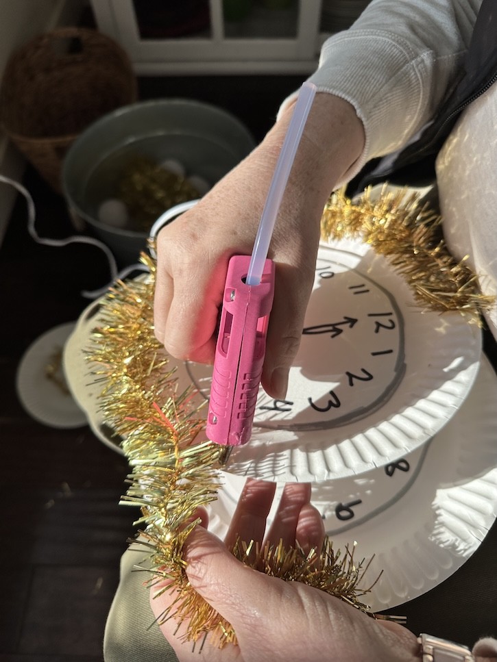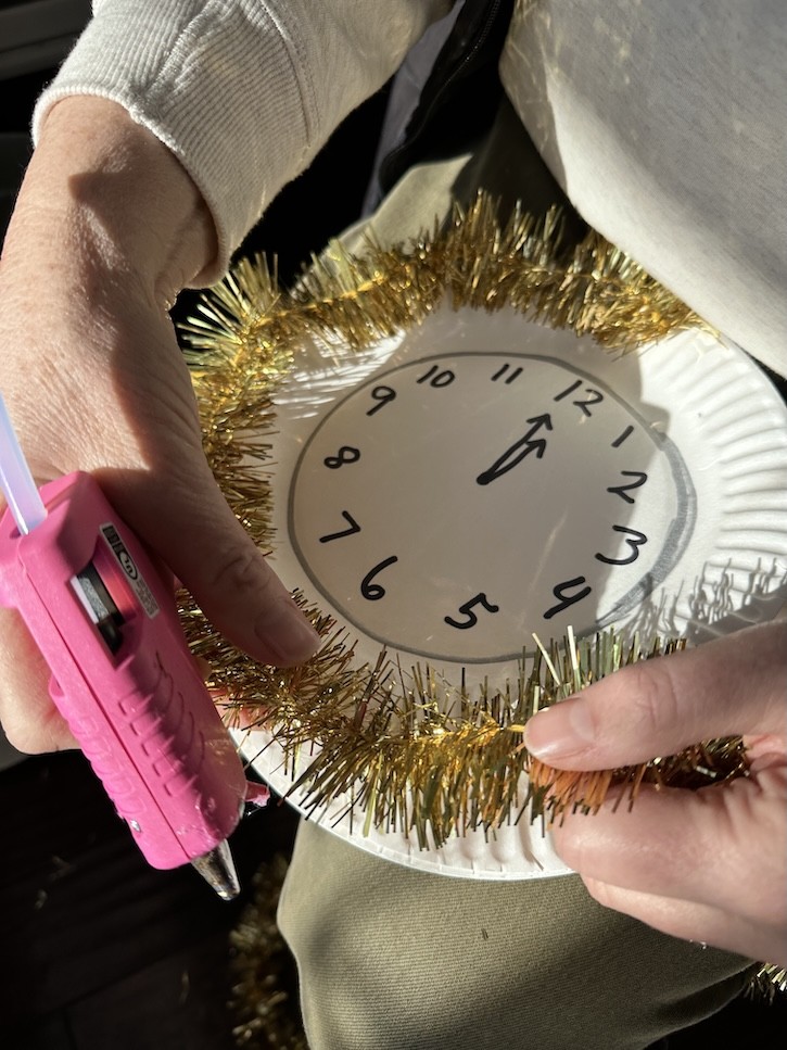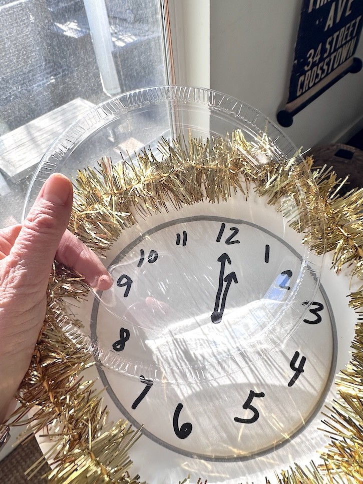 Once finished, I placed a clear plastic plate on top so the clock face shows through. Then I layered the whole thing on top of one of my gold chargers for an extra celebratory look.