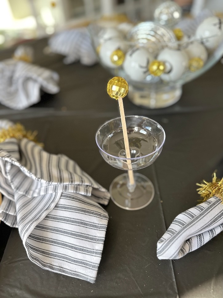 For drinks, we used plastic goblets from the dollar store — perfect for kids and adults alike. To make them feel special for New Year’s, we added DIY disco ball drink stirrers.