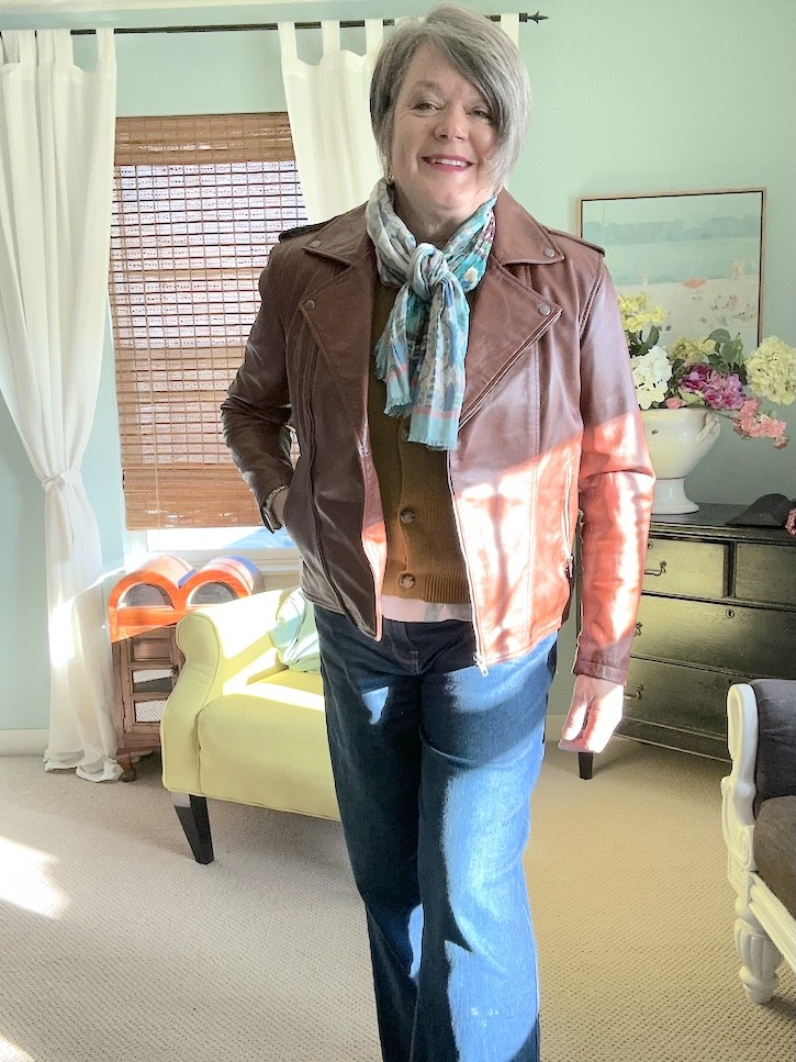 This is one of my favorite tricks for women over 50—one great jacket can completely change the vibe without needing to change your entire outfit. You can see how I styled my leather jacket over a dress here. It is so versatile.