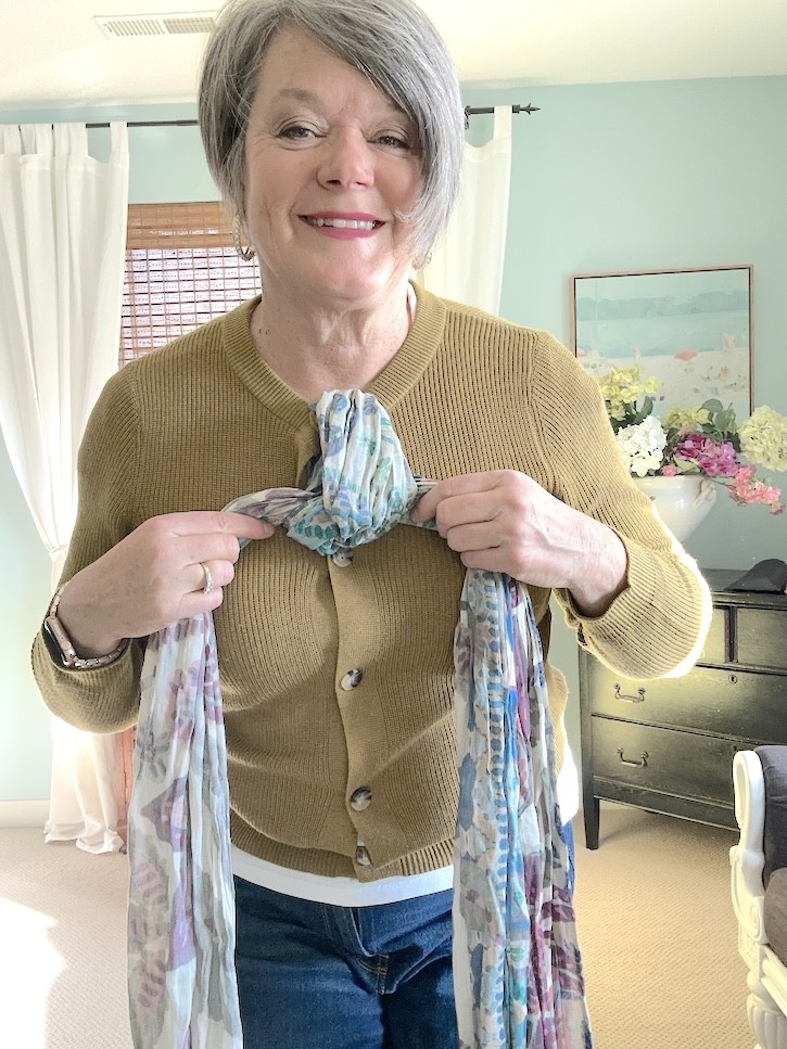 This scarf styling technique is what really transforms the outfit—and it’s especially great for women over 50 who don’t love anything tight around the neck. My scarf is sold out but I found another one you will love here.