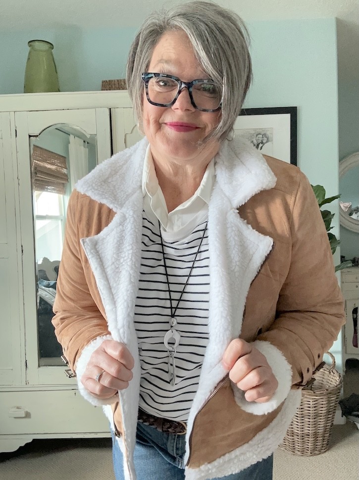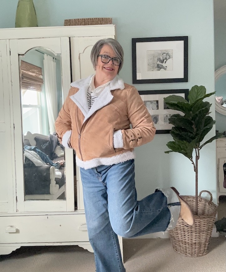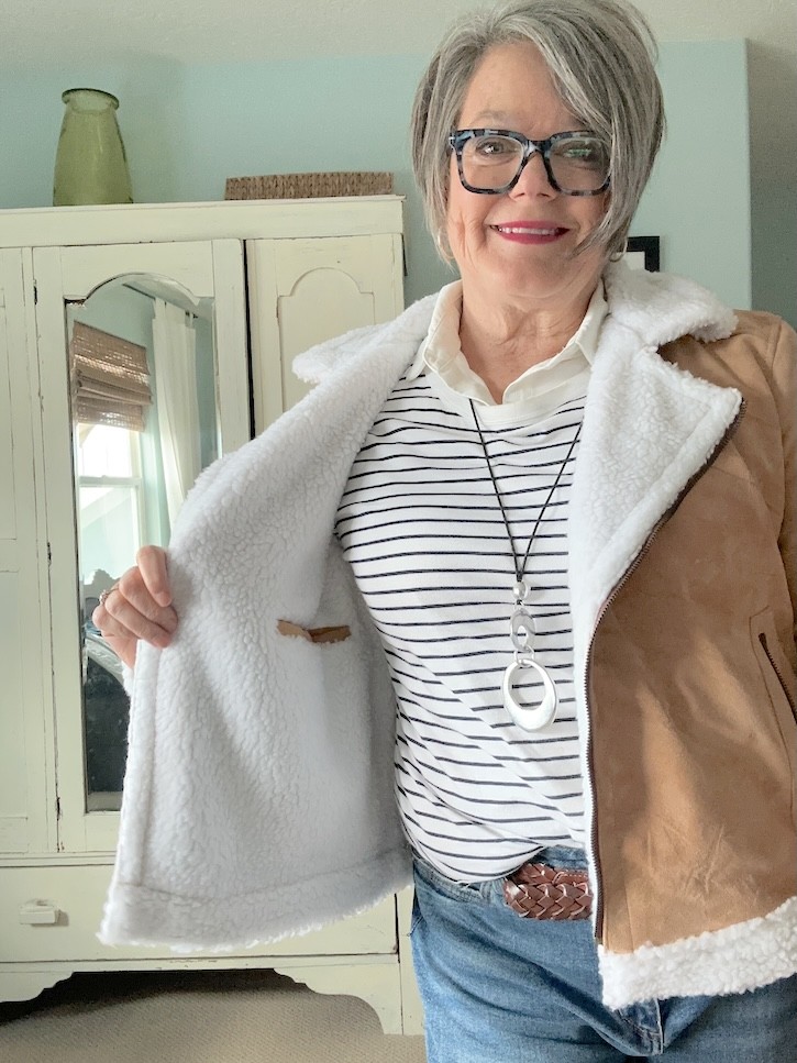 This brown suede biker jacket with fur is one of those pieces I know I’ll be reaching for all winter long. From the moment it arrived in the mail from Stegaro, I could tell the quality was something special. This is such a fun style for women over 50 that want to feel chic! The suede is buttery soft, the color is a beautiful rich brown, and the cozy sherpa lining makes it feel warm, snug, and incredibly comfortable.