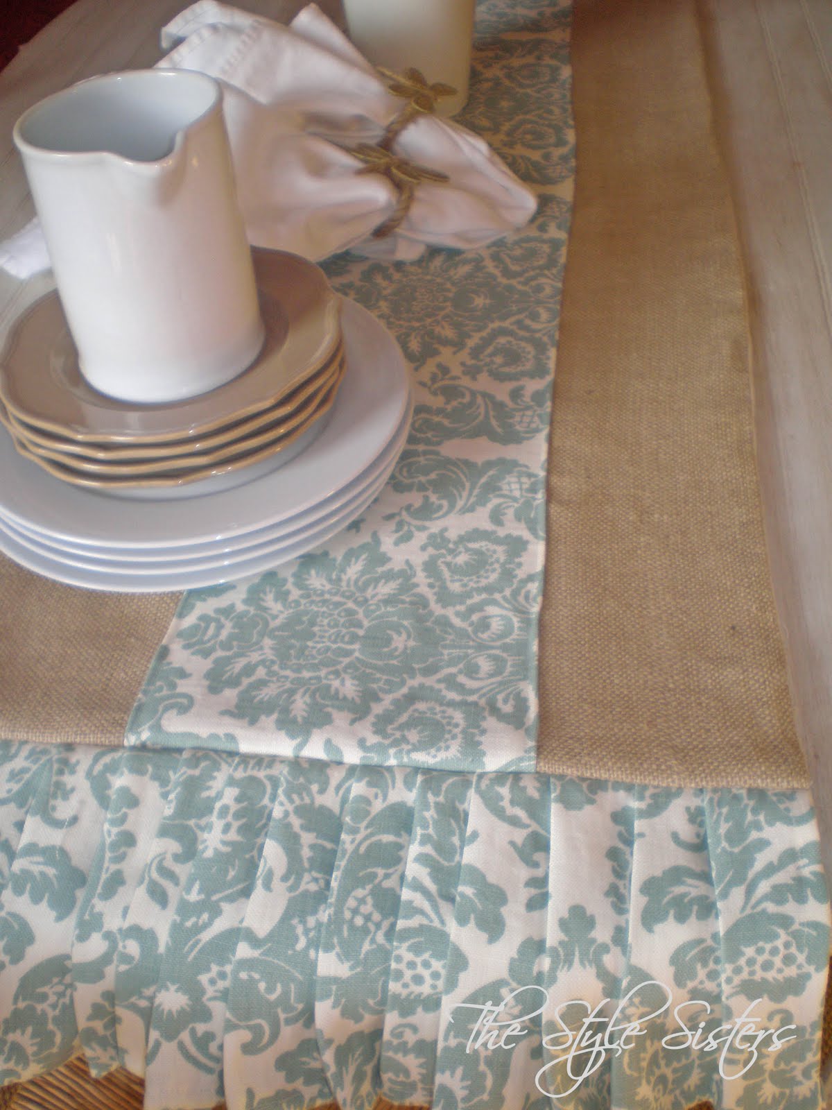 I just finished making this beautiful burlap and linen cream and turquoise runner with pleated ends.
