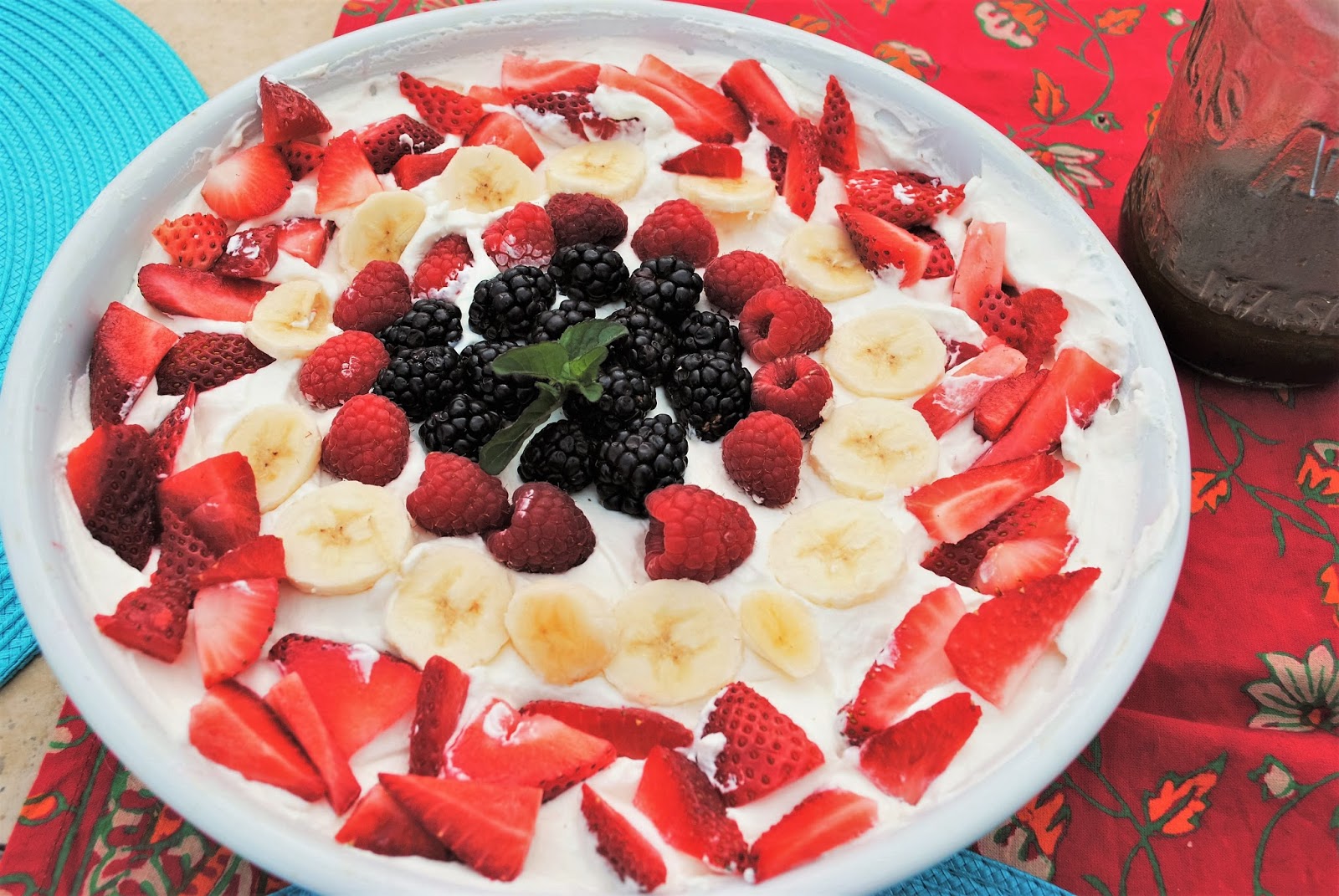 Sliced strawberries, raspberries, bananas and blackberries make it look so pretty!