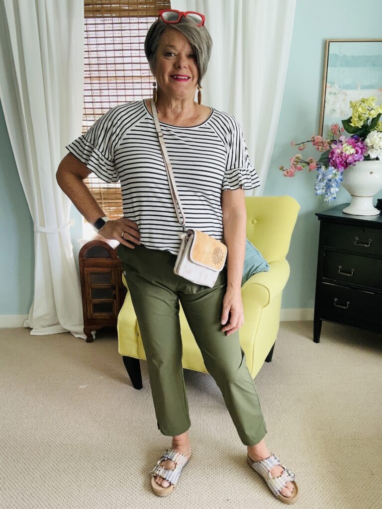 This comfy green golf pants outfit is one of those easy, everyday looks that works for real life. With non-wrinkly elastic waist pants, a striped t-shirt, a denim jacket, and a leather crossbody bag, this outfit is comfortable, flattering, and perfect for women over 50