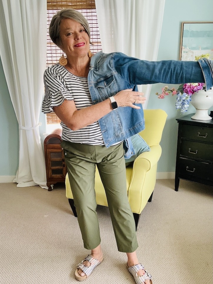 green pants denim jacket outfit women over 50