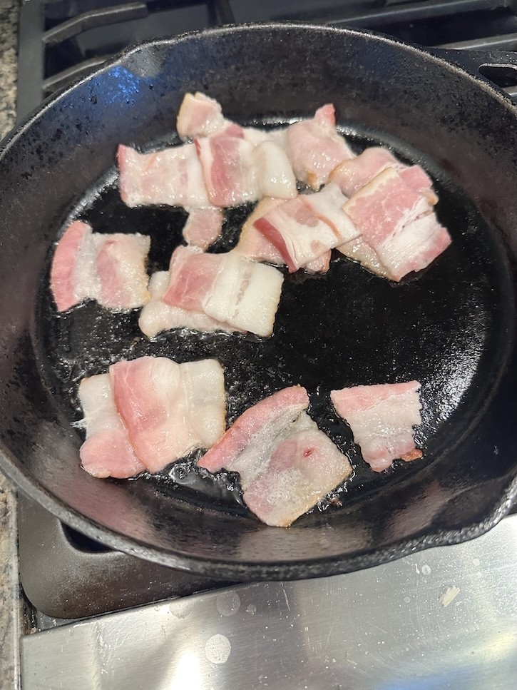 Arrange the bacon in a large, cold black cast iron skillet in a single layer (a little overlapping is fine). Turn the heat to medium and cook, flipping halfway, until crisp. Remove the bacon to a paper towel-lined plate and set aside.