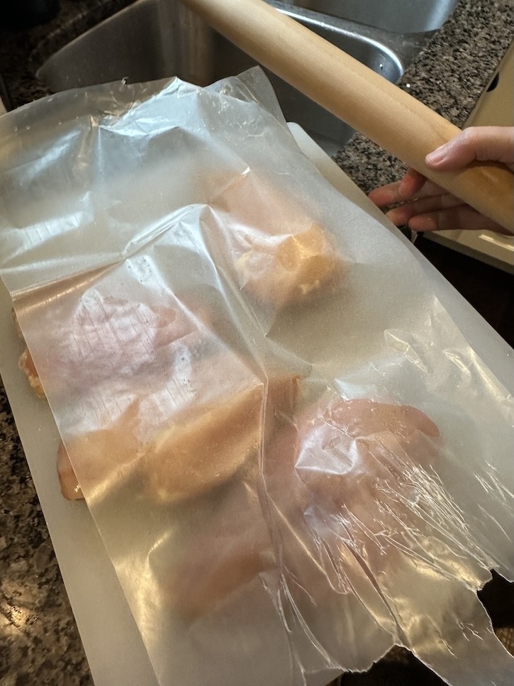 While the bacon cooks, pound the chicken breasts fairly thin to an even thickness. Cover chicken with wax paper and use a rolling pin to pound the chicken flat.
