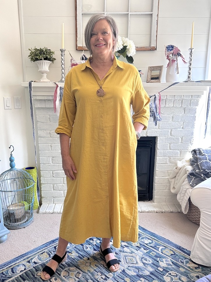 Recently, I shared one of my favorite summer fashion finds—this lightweight gold maxi dress with pockets, rolled sleeves, and so many ways to style it! You can dress it up or down for a breezy, elegant look.