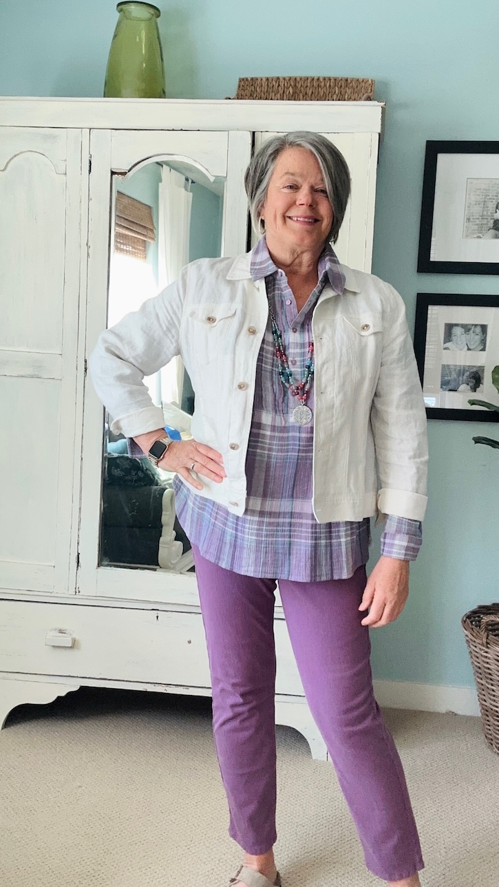 A Casual Spring Outfit with a Gauzy Purple Plaid Tunic