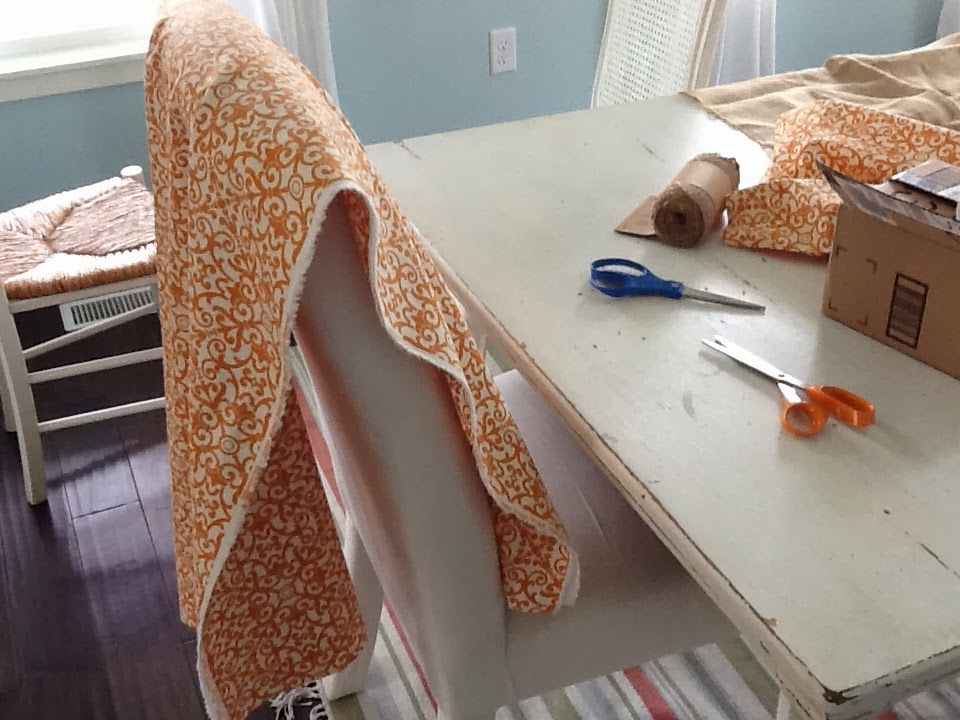 2. Purchase some coordinating fabric that you like (I got this from Joann’s) then drape over the chair to see how much you will need per chair. The fabric is doubled here…see next photo.