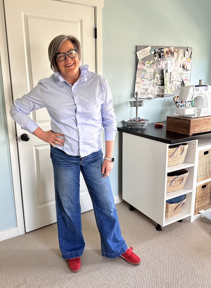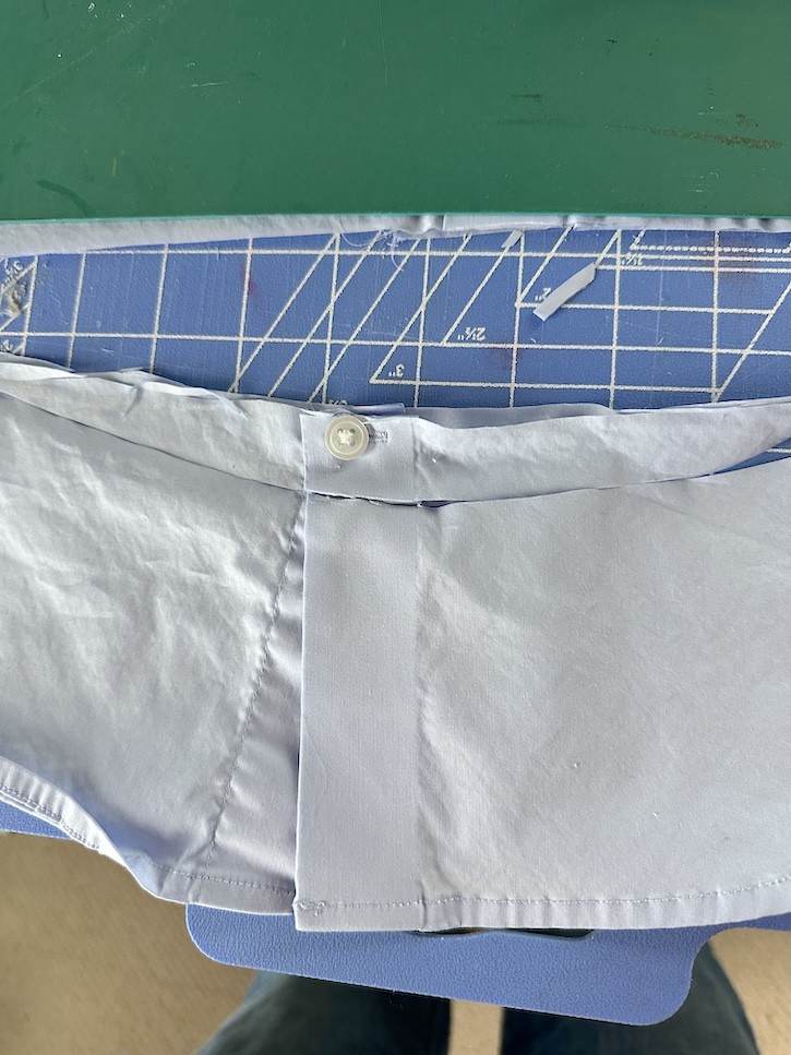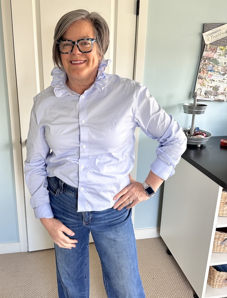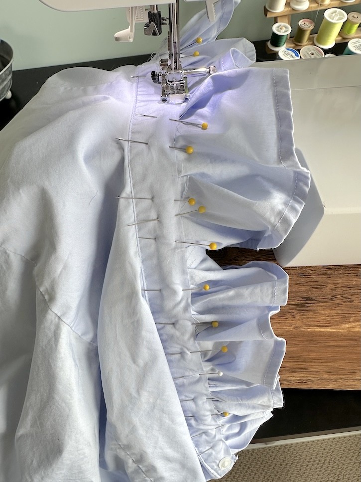 Here’s exactly how I upcycled a thrifted men’s shirt into a ruffle collar top.